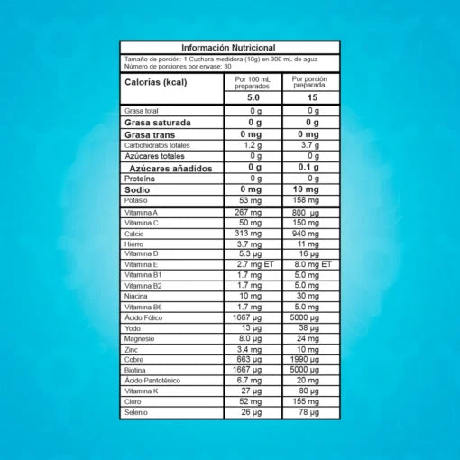 Ingredientes: Polvo Deshidratado de Frutos Amarillos, Citrato de Calcio, Carboximetilcelulosa (CMC), Coenzima Q10, Sabor Idéntico al Natural Naranja, Cloruro de Potasio, Vitamina C, Acido R-Alfa Lipoico, Sucralosa (Edulcorante), Citrato de Magnesio, Ácido Málico, Dióxido de Silicio (Anticompactante), Vitamina B3 (Niacina), Sulfato Ferroso, Citrato de Zinc, Ácido Pantotenico, Cloruro de Sodio, Bioperina, Citrato de Boro, Cobre, Piridoxina (Vitamina B6), Vitamina B2 (Riboflavina), Vitamina B1 (Tiamina), Ácido Fólico (Vitamina B9), Biotina, Yodo, Selenio, Vitamina K, Níquel, Vitamina A, Vitamina D, Vitamina E.